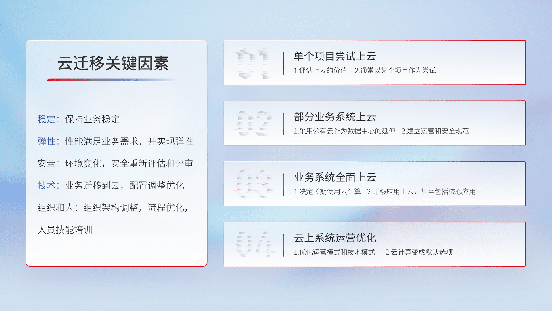 结合实际业务,,,,从规划设计、、、、云平台选型、、、、云原生改造、、、数据迁移、、、、集成交付,,,迁移全过程为客户识别最佳上云路径,,,做好风险识别管理,,,设计网络架构、、身份权限、、、、安全审计合规、、、操作审计、、、、日志审计、、监控告警策略、、、多站点容灾设计等,,,,对云上基础设施进行整体规划,,,,提升IT治理水平,,,以满足弹性、、高可用、、、高性能的需求。。
