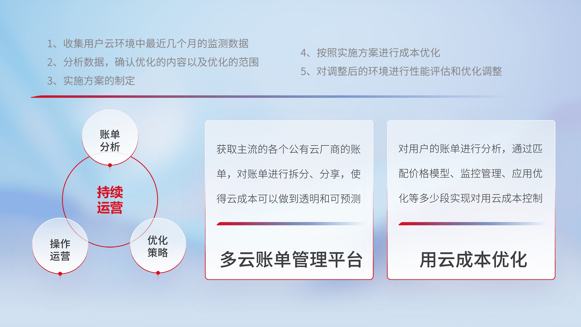 通过多云纳管,,,以统一的资源数据模型把客户的云资源进行抽象和封装,,,进而实现对多云资源的统一操作,,,保障云资源管理的可靠性、、、稳定性与可用性。。。量身定制化运维内容,,,,配置、、、开发运维、、补丁管理、、、、备份、、监控、、认证和访问管理、、、审计和日常巡检等,,,,保障在用云过程中的可靠度,,稳定度以及高可用率。。